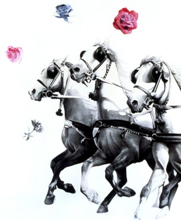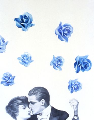 "In much of my recent work, I have used images from the movies because I think they relate to my audience the way I want them to, because a great many of them have seen the motion pictures that have images I can use. It's like using Flynn from the film "The Charge of the Light Brigade". It was a popular movie with an unusually famous star, so most people that don't know anything about painting or drawing say 'Ah, that's Errol Flynn, I love him.' They relate to this guy, so their immediate response puts them in the place of siding with this figure. When they look at the other part of the picture they see the woman floating in the water, with her hands bound, they don't know if she is dead or alive, and they must make a decision whether to love or hate this guy.