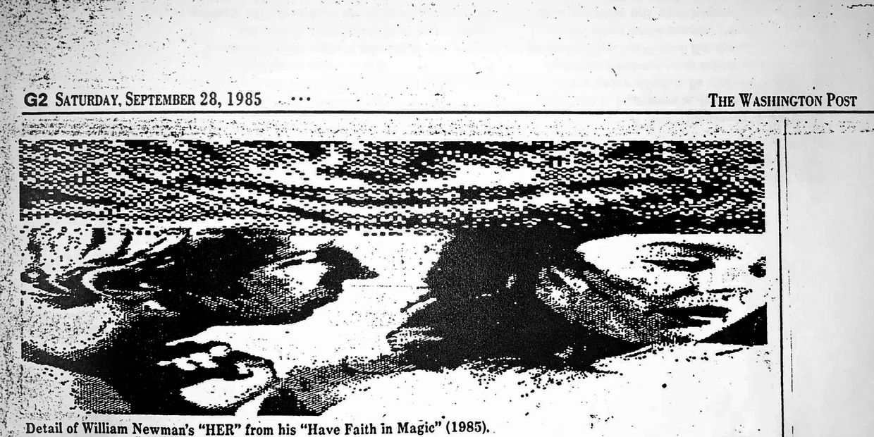 "Have Faith In Magic" is the title of William Newman's mechanized and sexy show at David Adamson's. Newman, 37, who's been teaching at the Corcoran for a dozen years, draws with brushes, pencils, Q-tip swabs, even paper towels. Because he has a skilled hand, and can catch a likeness, one is surprised to find here that he of late has placed his faith not in magic only but in digitizers, pixels and a Macintosh computer.